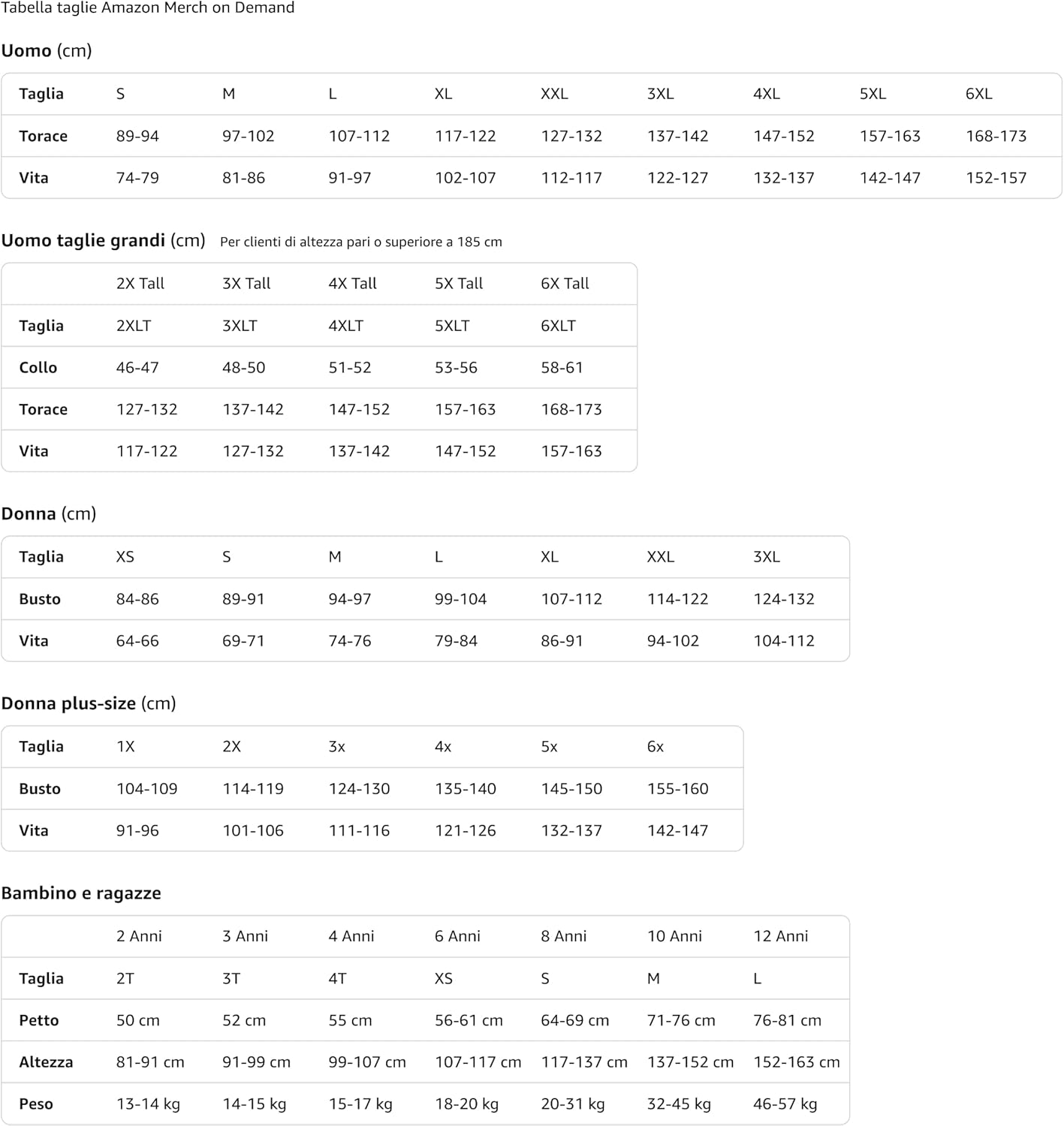S, M, L, XL, XXL, 3XL, 4XL, 5XL, 6XL, 2X Tall, 3X Tall, 4X Tall, 5X Tall, 6X Tall, XS, 1X, 2X, 3X, 4X, 5X, 6X, 2 anni, 3 anni, 4 anni, 6 anni, 8 anni, 10 anni, 12 anni, fit_type, Uomo, Uomo taglie grandi, Donna, Donna plus-size, Bambini